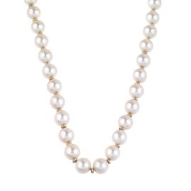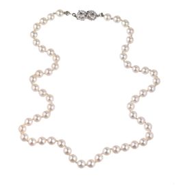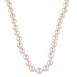 di cui una ad un filo di perle di mm 7 circa, fermatura in oro bianco 18kt impreziosita da zaffiri taglio rotondo, lungh. cm 49,5; seconda collana ad un filo di perle gold digradanti di mm 8-5 circa, fermatura in oro giallo e bianco 18kt, lungh. cm 57,5, accompagnata da una terza lunga collana con perle di mm 7 circa, fermatura e passanti in argento, lungh. cm 97, gr. 133 complessivi