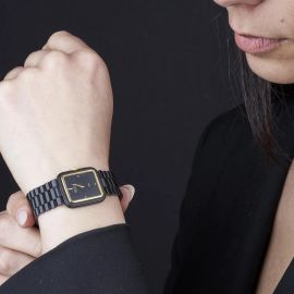 cassa in metallo brunito, fondello in acciaio a pressione, lunetta a scalino in metallo dorato, quadrante nero, grafica oro, indici applicati, movimento al quarzo, bracciale a maglie in metallo brunito, lungh. interna cm 19 circa, chiusura doppia deployant, vetro plastica. Dim. mm 23x28