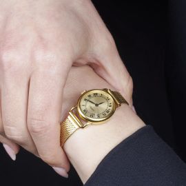 cassa di forma in oro giallo 18kt, punzone italiano, fondello a pressione, corona marcata, quadrante champagne, grafica nera, numeri romani, movimento a carica manuale cal ETA 2512, bracciale a maglia tessita e chiusura a scomparsa in oro giallo 18kt, vetro minerale, gr. 35. Dim. 22x31