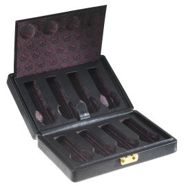 in pelle nera, metalleria in ottone, apertura a valigetta con pulsante, a doppio scompartimento, rivestita internamente da tessuto fantasia cachemire sui toni del rosso, contenente 8 alloggi per orologi da polso. Dim. cm 26x17,5x6,5