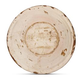 in maiolica dipinta in policromia, larga tesa inclinata su cavetto piano. La decorazione, riferibile al gruppo che Fausto Berti chiama “a spirali arancio”, prevede una serie continua di tratti arcuati arricciati all’estremità esterna accompagnati da tratti obliqui blu, disposti radialmente intorno ad un medaglione centrale a fondo giallo, occupato da un volatile in un paesaggio; gialla è anche la larga fascia che delimita il bordo esterno; diam. cm 36, diam. piede cm 16,8, alt. cm 6,5