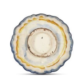 in maiolica dipinta in policromia, coppa con umbone centrale poco rilevato, orlo appena mosso e corpo sbalzato a formare sul retro serie di baccellature. Il decoro sul fronte mostra al centro un medaglione con uno struzzo su un prato, contornato da un decoro a quartieri con riserve contenenti ornati fogliati disposti simmetricamente; diam. cm 23,7, diam. piede cm 11,4, alt. cm 6,8