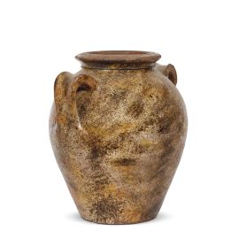 in terracotta invetriata dipinta in policromia, corpo ovoidale con ampio collo terminante in un largo orlo appena estroflesso, due larghe anse a nastro leggermente concave applicate nella parte superiore, sul fronte nella parte inferiore foro per la fuoriuscita del liquido; l’intera superficie mostra un decoro marezzato, interrotto sul fronte dal cartiglio farmaceutico iscritto AQA.DI.ACETOSA; alt. cm 39, diam. bocca cm 20, diam. base cm 17,6