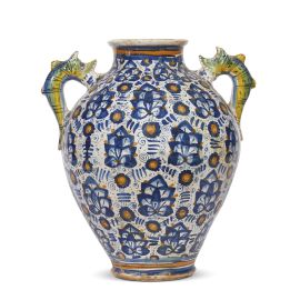 in maiolica dipinta in policromia, corpo ovoidale con piede a disco e collo cilindrico breve terminante in un orlo appena estroflesso e tagliato a stecca; dalla spalla scendono due anse a forma di drago che terminano con una coda semplice, non arricciata. Il collo è decorato da una linea giallo arancio con filetti in blu di cobalto, le anse dipinte in policromia con verde, giallo e blu con tocchi più scuri a definire le squame. Un largo motivo decorativo “a palmetta persiana” si estende su tutta la superficie del vaso, ad eccezione di una vasta porzione sul fronte occupata da un medaglione incorniciato da una ghirlanda robbiana arricchita da piccoli frutti e pigne, centrata da fioretti multipetalo e fermata da sottili nastri: al centro del medaglione lo stemma della famiglia fiorentina Catani (D'azzurro, alla fascia d'argento accompagnata da tre conchiglie d'oro), sormontato da una riserva con un uccello affrontato a una spiga di grano; ai lati dell’emblema due figure fantastiche “a candelabra” con teste barbate e corpi puntinati. Il vaso appartiene a un contesto farmaceutico nobiliare laico e trova puntuali riscontri nei manufatti delle botteghe di Montelupo, tra i quali la maggiore vicinanza nel progetto dell’impianto decorativo si riscontra con l’orcio ora conservato nella Galleria di Palazzo Cini a Venezia, già della collezione Pringsheim, anch’esso prodotto per una farmacia laica e pubblicato da Carmen Ravanelli Guidotti, unitamente a due esemplari molto simili recentemente transitati sul mercato londinese (Sotheby’s, From Earth to Fire, Londra 1 novembre 2018, lotto 622), che condividono con il nostro il decoro a “palmetta persiana”, ma anche la presenza di grottesche con figure mostruose barbate, lì a circondare l’emblema della famiglia Stepazola di Verona. Tutti questi confronti sono databili tra il 1545 e il 1580 circa, arco temporale che riteniamo conforme per il vaso qui presentato, accostabile per morfologia e decoro ad una coppia di orci venduti qui da Pandolfini il 16 novembre 2022 (lotto 33); alt. cm 42, diam. bocca cm 14,5, diam. piede cm 14,5