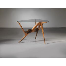 ROUND LOW TABLE, WOODEN STRUCTURE, GLASS TOP