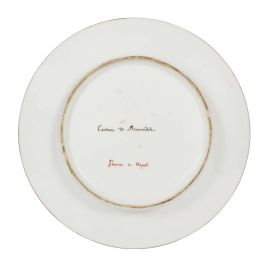 in porcellana dipinta in policromia e oro, raffigurante nel cavetto coppia di popolani danzanti, mentre la tesa mostra un ricco decoro in oro graffito. Il piatto rientra nella serie dei “costumi del regno”, presente in manifattura nei primi decenni del secolo XIX attraverso le gouaches realizzate dai pittori Della Gatta e D'Anna, inviati per volontà di Ferdinando IV nelle regioni del regno a riprodurne con fedeltà le vestiture tradizionali, dove l’Abruzzo è spesso rappresentato. Questo piatto dovrebbe trarre spunto dalle incisioni di Vianelli. Iscritto sul retro Costume di Rivisondoli in bruno e Giovine in Napoli in rosso; diam. cm 23,6