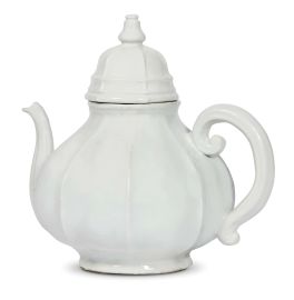 in porcellana bianca, corpo globulare costolato, beccuccio che parte dalla pancia con un attacco sagomato e si erge alto e arcuato, ansa ricurva e sagomata, da modello derivato dall’argenteria, mentre il coperchio con alto pomolo si erge a cupola. La teiera per forma e caratteristiche tecniche e stilistiche trova riscontro nella prima produzione della manifattura attorno agli anni cinquanta; cm 17x17,5x12,5