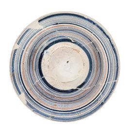 in maiolica dipinta in policromia, al centro del cavetto motivo alla “palmetta persiana”, sulla balza e sulla tesa motivo ad archetti e al retro motivo “a calza”. Il motivo a palmetta è qui protagonista, posto al centro in una versione “a fiore” accompagnata da una fitta decorazione complementare che ne esalta l’importanza. Per modalità stilistiche e materiche l’opera si può inserire nella produzione faentina del secolo XV e trova numerosi confronti nei materiali provenienti dagli sterri della città romagnola; diam. cm 18,2, alt. cm 4,6