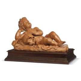 Rome, 17th century, A putto resting on a skull, patinated terracotta, 30x52x22 cm