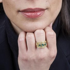 in oro giallo 18kt, impreziosito da tre smeraldi taglio ovale per ct 0.50 circa, circondato da diamanti taglio huit huit per ct 0.30 circa, punzoni 750 e del fabbricante, mis. 55, gr. 7