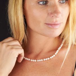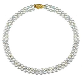 di cui una ad un filo di perle di mm 6 circa, fermatura e distanziali in oro giallo 18kt, impreziosita da tre diamanti taglio brillante, punzone del fabbricante, lungh. cm 48,5, accompagnata da una seconda collana a a doppio filo di perle grigie di mm 6 circa, fermatura in oro giallo 18kt, punzoni 750 e del fabbricante, lungh. cm 47, gr. 88 complessivi