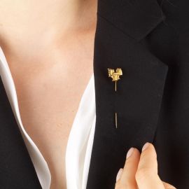 di cui una spilla "Galletto" di Salvatore Fiume in oro giallo 18kt, firmata "Fiume", dim. cm 1x5,5 circa, corredata di custodia Dialoghi Club, certificato d'origine e dichiarazione di autenticità del 24/03/1986; una spilla "Geometria" di Cappello Carmelo in oro giallo 18kt, firmata "C.Cappello", dim. cm 1x6 circa, corredata di custodia Dialoghi Club e copia di dichiarazione di autenticità del 24/03/1986; accompagnati da una terza spilla "Il Cavallino" di Aligi Sassu, in oro giallo 18kt, firmata "Sassu", dim. cm 2x5,5, corredata di custodia Dialoghi Club, certificato d'origine e copia di dichiarazione di autenticità del 1986, punzoni 750, del fabricante e firma " Dialoghi Club", gr. 5 complessivi circa