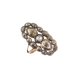 anello in oro e argento, impreziosito da rose di diamante, mis. 10/50, accompagnato da una demi parure composta da una spilla a tralcio in oro a basso titolo, dim. cm 5x3 circa, con paio di orecchini pendenti in oro a basso titolo, chiusura a farfallina in oro giallo 18kt, lungh. cm 4, gr. 15 complessivi