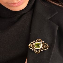 in oro e argento, impreziosita al centro da una pasta vitrea verde sfaccettata e diamanti taglio vecchio per ct 0.60 circa, dim. cm 5x3,5, gr. 21