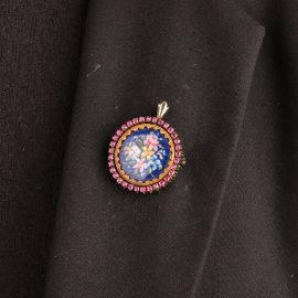 in oro e argento, di forma rotonda, con parte centrale entro cornice decorata in smalti policromi raffiguranti un mazzo fiorito, circondata da una fila di rubini taglio rotondo per ct 1 circa, passante in oro bianco 18kt, dim. cm 3x3,5 circa, gr. 14