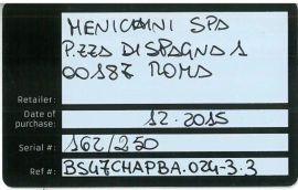 cassa in acciaio rifinita in PDV canna di fucile, fondello a vite, tasti del crono rettangolari a ore dodici, bordo cesellato, scala tachimetrica sul disco rehaut, quadrante nero tapisserie con immagine di teschio multicolor al centro ai cui lati si dipartono i contatori del crono, secondi a ore sei, datario a ore dodici, movimento a carica automatica, cinturino originale in pelle marrone decorata con rilievo di teschi e motivi floreali, fibbia in acciaio pvd nero marcata Bomberg, vetro minerale. Diam. mm 47