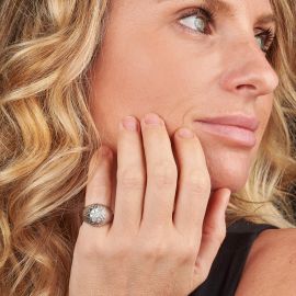 in oro bianco inciso 18kt, al centro un motivo floreale impreziosito da diamanti taglio brillante per ct 0.80 circa, punzone 750, mis. 11/51, gr. 9