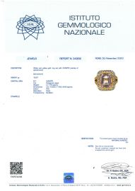 in oro giallo e bianco 18kt, al centro una kunzite di ct 7.70 circa circondata da una fila di diamanti taglio brillante per ct 0.40 circa, mis. 11/51, gr. 16. Corredato di certificato IGN del 2/11/2023 attestante le caratteristiche.