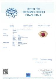 in oro giallo 18kt, impreziosito al centro da un rubino tailandese taglio ovale di ct 1.60 circa, circondato da diamanti taglio brillante e baguette per ct 2.25 circa, mis. 9/49, gr. 7. Corredato di certificato IGN del 06/09/2023 attestante le caratteristiche.