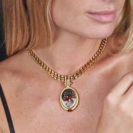 in oro giallo 18kt, realizzata a maglia groumette, con pendente di forma ovale impreziosito da un'agata incisa e diamanti taglio brillante per ct 0.10 circa, firmata "Bulgari", punzoni 750 e del fabbricante, lungh. cm 37,5, dim. pendente cm 3x5,5, gr. 122