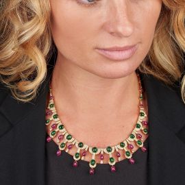 in oro giallo 18kt, impreziosita da smeraldi taglio cabochon per ct 18 circa, rubini taglio cabochon per ct 21 circa e diamanti taglio brillante per ct 3.70 circa, punzone 18kt, lungh. cm 44, gr. 70