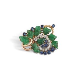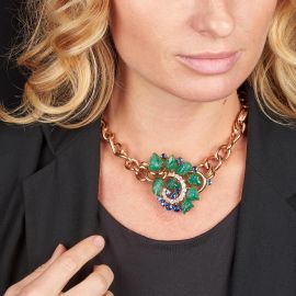 in oro rosa 18kt, composta da una serie di maglie concatenate, unite al centro da una spilla amovibile a forma di tralcio con foglie in smeraldi incisi, zaffiri taglio rotondo per ct 5 circa e diamanti taglio vecchio per ct 2.40 circa, firmata "Mauboussin", punzoni francesi dell'oro, del fabbricante e n. seriale, lungh. cm 39, gr. 110