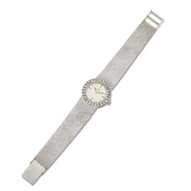 cassa in oro bianco 18kt, fondello a pressione, corona marcata, lunetta impreziosita da doppia fila di diamanti, quadrante argenté, indici applicati, movimento a carica manuale, bracciale integrato a maglia tessita in oro bianco 18kt con chiusura a scomparsa in oro bianco, vetro plastica, gr. 48. Diam. mm 24