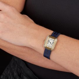 cassa di forma in oro giallo 18kt, fondello serrato con viti, corona con zaffiro cabochon, lunetta a tre scalini in oro giallo 18kt, quadrante bianco, grafica nera, numeri romani a smalto, movimento a carica manuale, cinturino originale in pelle nera, lungh. interna cm 18, fibbia deployant in oro giallo 18kt firmata Cartier, vetro minerale, gr. 34. Dim. mm 24x30. Corredato di scatola.
