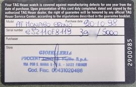 cassa di forma in acciaio, fondello serrato con viti, tasti del crono rettangolari, corona marcata, lunetta in acciaio, quadrante nero, grafica bianca, indici applicati al trizio, contatore dei secondi a ore nove, contatore dei minuti a ore tre senza riquadro, datario a ore sei, movimento a carica automatica, cinturino originale in pelle nera, fibbia in acciaio marcata Heuer, vetro plastica. Dim. mm 38x47. Corredato di scatola, controscatola e garanzia.