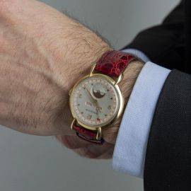 cassa in oro giallo 18kt, fondello a pressione, anse a goccia, quadrante argentè, grafica nera e rossa, numeri arabi e indici applicati, datario a doppia finestra, calendario completo, fasi lunari, secondi a ore sei, movimento a carica manuale, cinturino originale in pelle bordeaux, fibbia in metallo dorato, vetro plastica, gr. 46. Diam. mm 35