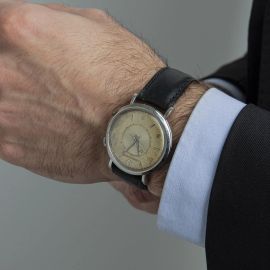 cassa in acciaio, fondello pressione, quadrante argentè, grafica nera, indici e numeri arabi applicati, doppia corona, disco interno con puntatore triangolare per sveglia, movimento a carica manuale, cinturino in pelle nera e fibbia in acciaio non originali, vetro plastica. Diam. mm 34