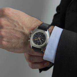 cassa in acciaio, fondello a vite con logo Seamaster, tasti a pompa, corona marcata, lunetta in acciaio satinato, quadrante nero con scala tachimetrica su disco esterno, grafica bianca, applicati al trizio, contatore dei secondi a ore nove, contatore dei minuti a ore tre, contatore delle ore alle sei, movimento a carica manuale cal 321 n. 25442904, cinturino originale in pelle nera, fibbia in acciaio marcata Omega, vetro plastica. Diam. mm 38. Corredato di scatola.