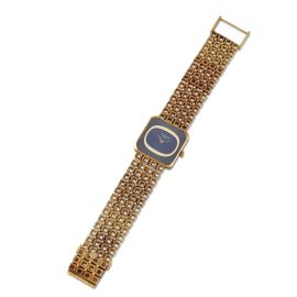 cassa di forma in oro giallo 18kt, fondello a pressione, bordo satinato, corona marcata, quadrante blu Sigma (difetti), grafica bianca, movimento a carica manuale cal 16-250 n. 1271952, bracciale in oro giallo 18kt ad elementi geometrici satinati alternati a microsfere in oro giallo, lungh. cm 17 circa, chiusura a scomparsa in oro giallo 18kt marcata Patek Philippe, gr. 82. Dim. mm 25x25. Corredato di scatola.