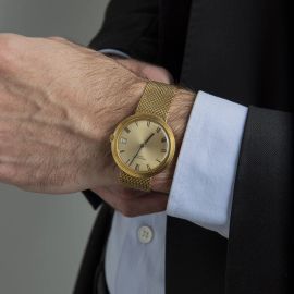 cassa in oro giallo 18kt, fondello a pressione, corona marcata, quandrante champagne, grafica nera, numeri romani a smalto, datario a ore tre, movimento a carica automatica cal 27-460M n. 1118199, bracciale integrato a maglia tessita in oro giallo 18kt, chiusura in oro giallo 18kt marcata Patek Philippe, vetro plastica, gr. 85. Diam. mm 35. Corredato di scatola.