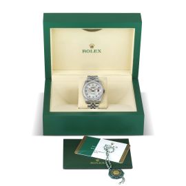 cassa in acciaio, fondello serrato a vite marcato 2080, corona marcata, ghiera impreziosita da piccoli brillanti applicati successivamente, quadrante originale in madreperla, grafica nera, indici con brillanti, datario a ore tre con lente cyclope, movimento a carica automatica cal 3135 n. 32N588Y0, bracciale jubilee ref. 63600, finali 5LX, lungh. interna cm 19, chiusura deployant a scomparsa marcata Rolex, vetro minerale. Diam. mm 35. Corredato di scatola, controscatola, garanzia e una maglia aggiuntiva.