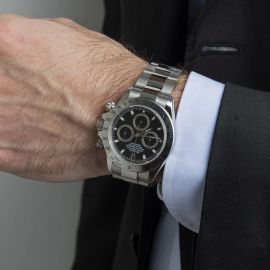 cassa in acciaio, fondello serrato a vite, corona marcata e pulsanti a vite, ghiera in acciaio con scala tachimetrica a 400, quadrante nero, grafica bianca, indici applicati al superluminova, contatore dei secondi a ore nove, contatore dei minuti a ore tre, contatore delle ore alle sei, movimento a carica automatica cal 4130 n. C 0013261, bracciale oyster a maglie piene satinate e lucide in acciaio ref. 78490 cod. produzione DT1, lungh. interna cm 18, chiusura a scatoletta in acciaio marcata Rolex, vetro minerale. Diam. mm 40.