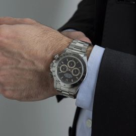 cassa in acciaio, fondello serrato a vite, corona marcata e pulsanti a vite, ghiera in acciaio con scala tachimetrica a 400, quadrante nero, grafica bianca, indici applicati al trizio, contatore dei secondi a ore nove, contatore dei minuti a ore tre, contatore delle ore alle sei, movimento a carica automatica, bracciale oyster a maglie piene satinate e lucide in acciaio ref. 78390 finali 503B cod. produzione W5, lungh. interna cm 19, chiusura a scatoletta in acciaio marcata Rolex, vetro minerale. Diam. mm 40. Corredato di scatola non coeva, garanzia originale e due maglie aggiuntive.