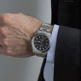 cassa in acciaio, fondello serrato a vite, lunetta liscia in acciaio, corona marcata, quadrante nero, grafica bianca, indici e numeri arabi applicati al superluminova, movimento a carica automatica cal 3132 n. 34867094, bracciale oyster in acciaio a maglie piene ref. 77200 finali RS, lungh. interna cm 19 circa, chiusura deployant a scomparsa marcata Rolex, vetro minerale. Diam. mm 39. Corredato di scatola e garanzia.
