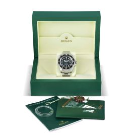 cassa in acciaio, fondello serrato a vite, ghiera in acciaio con inserto in ceramica nera, quadrante nero, grafica bianca, bicchierini al superluminova, valvola elio e sistema di blocco della ghiera, datario a ore tre, movimento a carica automatica, bracciale oyster a maglie piene in acciaio, cod. produzione PJ5, lungh. interna cm 20, chiusura a scatoletta in acciaio marcata Rolex, vetro minerale. Diam. mm 44. Corredato di scatola, controscatola, garanzia, libretto e due maglie aggiuntive.