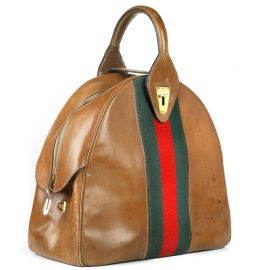 In cuoio a forma di morso di cavallo, con maxi web verde rosso verde frontale e manico rigido; chiusura con zip.