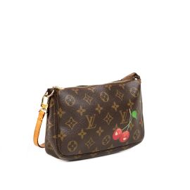 Questa pochette Louis Vuitton da collezione è un pezzo in edizione limitata della collezione Primavera/Estate 2005. Creato dal designer giapponese Takashi Murakami per Louis Vuitton, questo ambito design presenta tela Monogram Cerises con manico in pelle naturale e hardware in ottone dorato. I dettagli includono una chiusura con zip e interni foderati in tessuto. Questo accessorio versatile può essere trasportato tramite la maniglia superiore o nascosto all'interno di una grande borsa per riporre tutti gli oggetti essenziali quotidiani.