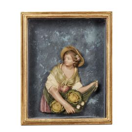 in cera policroma, raffigurante una fruttivendola che trattiene col grembiule cavoli e uova e un oste mentre tiene in mano una brocca di vino davanti a una tavola imbandita; entrambe recano sul retro una targa con iscritto: B. KASPAR HARDY, cm 22x18