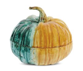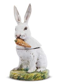 in maiolica dipinta in policroma, sagomate rispettivamente a forma di zucca (alt. cm 20,5, diam. cm 24,2), a forma di coniglio seduto (cm 36x18x28,8) e a forma di papera accovacciata (cm 17,5x30,5x17)