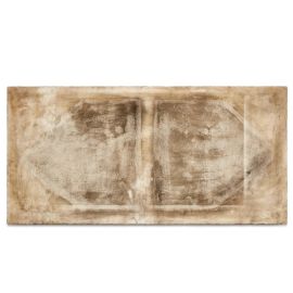 Di forma rettangolare, il piano presenta un articolato impianto decorativo sviluppato intorno ad un grande cartiglio di forma sagomata realizzato in broccatello, che ospita al centro un medaglione in alabastro fiorito incorniciato da una sequenza alternata di piccoli fiori quadripetalo ed ovali decorati con numerose varietà di marmi vari e madreperla. All’esterno del fregio la decorazione si sviluppa sul fondo del nero del Belgio con ampie girali foglate e due grandi fiori posti al centro dei lati corti, il tutto chiuso all’esterno da un profilo lineare in marmo Africano, che agli angoli si apre in quattro riserve a forma di cuore.