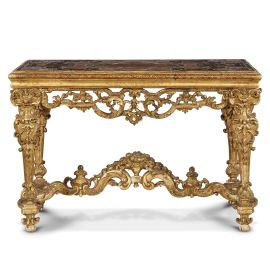 Montato ad incasso su TAVOLO DA MURO, ROMA, INIZI SECOLO XVIII in legno intagliato e dorato, sostenuta da quattro gambe decorate sul fronte da rilievi di ispirazione vegetale riunite tra loro da traversa sagomata centrata da vaso traboccante di fiori; cm 87x132x67,5