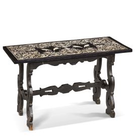 di forma rettangolare decorato in monocromia bianca su fondo nero, bordo ornato da grandi girali fogliacei e gigli stilizzati entro profilatura ad incorniciare, al centro della composizione, quattro uccellini raffigurati di profilo e in maniera speculare, montato su tavolo in stile seicentesco in legno intagliato con sostegni a lira, cm 79x130x65