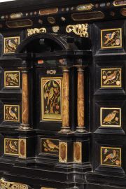 in ebano e pietre dure con applicazioni in bronzo dorato. Fronte di linea spezzata impreziosito al centro da una nicchia architettonica con un grande sportello centrale ed un cassetto sottostante inquadrati da una doppia coppia di colonne su alto piedistallo, ai lati delle quali sono disposti otto cassetti su due file sia a destra che a sinistra. Sia lo sportello che tutti i cassettini mostrano sul fronte una placca in marmo nero del Belgio inarsiata in pietre dure, tutte diverse tra loro ma decrate con uguale soggetto: un uccello appollaiato su ramo con foglie e frutti, talvolta accompagnato da una farfalla; cm 100x154x44