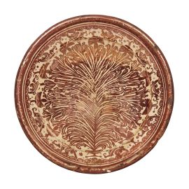 in maiolica decorata a lustro metallico, il bacile ha corpo svasato interamente decorato a motivi stilizzati centrati da grande pianta fiorita entro piccolo vaso (diam. cm 33, alt. cm 8,5), i due piattini decorati uno con una pianta fiorita entro vaso e fregi stilizzati sulla tesa (diam. cm 21), l’altro con un triplice fiore in blu su fondo con molteplici ovali con linee tratteggiate (diam. cm 19)