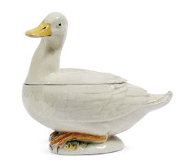 in maiolica dipinta in policromia forgiate rispettivamente a forma di mazzo di asparagi (alt. cm 21,5, diam. cm 12), a forma di tacchina (cm 30x34x15) e a forma di anatra (cm 25,5x27,2x13,2)