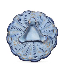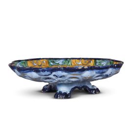 La coppa dalla foggia sottilmente baccellata, caratterizzata da un piede a sezione triangolare a sua volta sorretto da tre piccoli piedi ferini, mostra un decoro a quartieri suddivisi in ampie sezioni campite di giallo arancio e centrate da tre riserve a petalo campite di verde. Il decoro a grottesche, delineate in blu cobalto in due toni, mostra degli amorini all’interno dei petali e girali fogliate e delfini sulle restanti superfici. Al centro della composizione, inscritta in una riserva triangolare, la raffigurazione di un paggio con un copricapo piumato e un piccolo bastone nella mano destra mentre incede in paesaggio collinare. Il retro mostra riprese fitomorfi in giallo e blu e piccoli tocchi su smalto berettino.